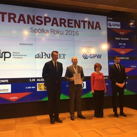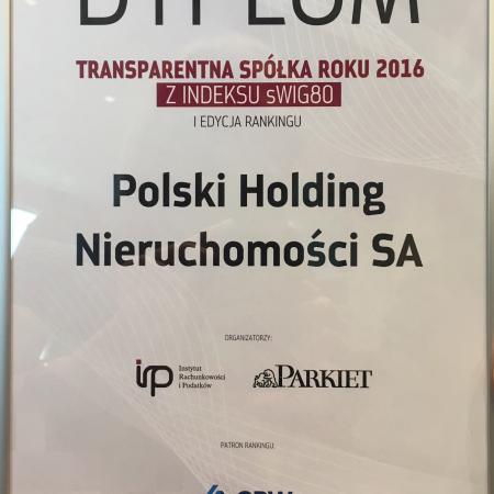 Polski Holding Nieruchomości S.A. received the title of “Transparent Company of the Year 2016” in the first edition of the ranking prepared by the Accounting and Tax Institute and “Parkiet” stock exchange daily.The ranking’s results were based on a survey among companies, covering three major areas of communication with the market:financial reporting, investor relations and corporate governance principles.